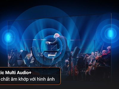 – Khi nghe nhạc, xem phim hay trải nghiệm trận bóng đá của đội bạn yêu thích, âm thanh được tạo ra sẽ làm người xem bị “hớp hồn” ngay giây đầu tiên bởi công nghệ Acoustic Multi-Audio+ điều chỉnh âm thanh đồng bộ với hành động, chất âm phát ra trực tiếp từ màn hình cho cảm nhận âm thanh chính xác, sống động ngoạn mục. Với loa tweeter lắp trên khung viền cho chất âm được truyền tải rộng khắp, vang xa và bùng nổ hơn.