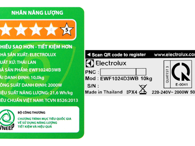 – Nhãn năng lượng 5 sao. Hiệu suất sử dụng điện 21.6 Wh/kg.