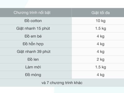 Sản phẩm có 8 chương trình giặt thường dùng nổi bật bao gồm: làm mới, giặt nhanh 15 phút, đồ em bé, đồ tổng hợp, giặt nhanh 39 phút, đồ cotton, giặt tiết kiệm, đồ mỏng và 7 chương trình giặt khác (Xem chi tiết chương trình giặt tại đây). Trong đó chương trình giặt 15 phút giúp loại bỏ bụi bẩn quần áo nhanh gọn, tiết kiệm thời gian giặt giũ cho gia đình bạn.