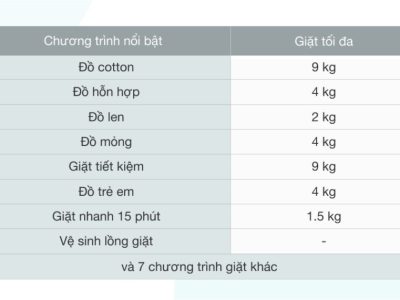Các chương trình giặt hay dùng được tích hợp sẵn như: Đồ cotton, đồ hỗn hợp, đồ mỏng, giặt tiết kiệm, đồ len, giặt nhanh 15 phút và vệ sinh lồng giặt,… (xem chi tiết tại bảng thông số kỹ thuật).