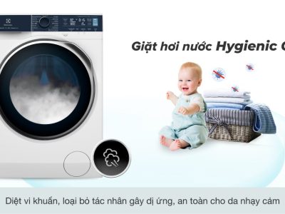 Quần áo được làm sạch nhờ chức năng giặt hơi nước Hygienic care, nước được làm nóng thành hơi và phun vào quần áo. Chức năng này khá thích hợp với những loại quần áo ít bẩn, mỏng, dễ nhăn, cần nâng niu như: quần áo trẻ em, áo sơ mi, vải voan, lụa… Tính năng này giúp bạn loại bỏ được các tác nhân gây dị ứng, bảo vệ làn da của bạn.