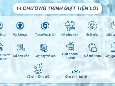 – Mẫu máy giặt này được thiết lập 14 chương trình giặt: vải bông, TurboWash 39, vải bông +, giặt hơi nước đồ trẻ em, giặt ngừa dị ứng, chu trình tải về, giặt nhanh 14 phút, giặt nhẹ, giặt ga giường, đồ hỗn hợp, giặt tay + đồ len, đồ thể thao, đồ tinh xảo và vệ sinh lồng giặt. Tùy theo từng loại quần áo, đồ dùng, chất liệu mà bạn lựa chọn chương trình giặt thích hợp nhất.
