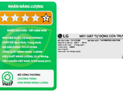 – Máy giặt LG Inverter này đạt nhãn hiệu năng lượng 5 sao với hiệu suất sử dụng điện 25.47 Wh/kg.