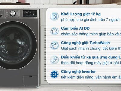 – Với khối lượng giặt 12 kg, chiếc máy giặt LG này thích hợp cho gia đình trên 7 người sử dụng.