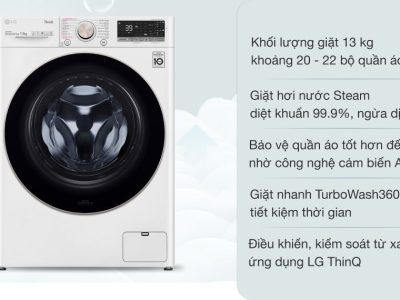 Máy giặt LG Inverter 13 kg FV1413S3WA với khối lượng giặt tối đa 13 kg, sở hữu các công nghệ giặt hơi nước, nước nóng diệt khuẩn, ngừa dị ứng, công nghệ cảm biến AI DD, 6 Motion DD giặt sạch, bảo vệ quần áo và khả năng tiết kiệm điện từ công nghệ Inverter cùng tiện ích điều khiển, kết nối máy giặt thông qua smartphone. Đây sẽ là mẫu máy giặt lồng ngang đáng quan tâm dành cho các gia đình có đông thành viên (từ 7 người) với nhu cầu giặt giũ cao.