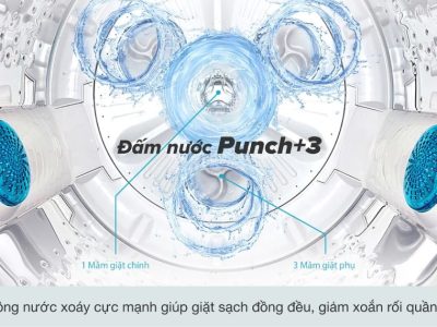 Công nghệ đấm nước và 3 mâm giặt phụ (Punch+3) của máy giặt LG Inverter có cấu tạo đấm nước nằm ở giữa mâm giặt chính, đồng thời kết hợp 3 mâm giặt phụ xung quanh để tạo ra những dòng nước xoáy cực mạnh nhào trộn quần áo lên xuống liên tục theo phương thẳng đứng, giúp quần áo được giặt sạch đồng đều.
