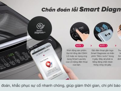 Chỉ cần cài đặt ứng dụng Smart Diagnosis trên điện thoại thông minh, bạn có thể chẩn đoán và xử lý nhanh các lỗi hay gặp trên máy giặt LG như: đặt quần áo không cân, nắp máy giặt không chặt, đường nước vào bị hở,.v.v.. mà không làm gián đoạn công việc giặt giũ và tiết kiệm chi phí sửa chữa cho bạn.