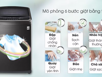 Trên máy giặt lồng đứng này, LG trang bị thêm công nghệ Turbo Drum tạo dòng nước xoáy nhờ mâm giặt và lồng giặt hoạt động ngược chiều giúp quần áo được giặt sạch hơn trông thấy.