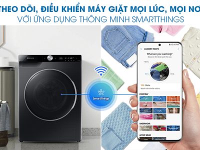 Ngoài ra, bảng điều khiển với màn hình hiển thị quy trình giặt và các hướng dẫn thông minh bằng tiếng Việt dễ nhìn và có thể kết nối với ứng dụng SmartThings điều khiển từ xa qua điện thoại.