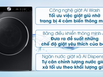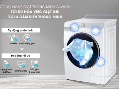 Với AI Wash, 4 cảm biến (khối lượng quần áo, độ bẩn, lượng nước, lượng nước giặt/nước xả). Công nghệ này nhận biết khối lượng áo quần, tự động điều các thông số như chế độ giặt, lượng nước, lượng nước giặt/xả, thời gian,… cho phù hợp.