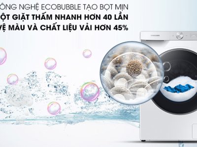 Công nghệ EcoBubble kích hoạt nước giặt/bột giặt với sự kết hợp giữa khí và nước, tạo thành bong bóng siêu mịn thẩm thấu vào sợi vải nhanh gấp 40 lần so với cơ chế máy giặt thông thường.