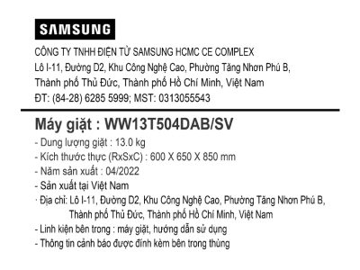 Máy giặt Samsung Inverter 13 kg WW13T504DAB/SV Model 2022 – loại máy giặt lồng ngang giặt mạnh mẽ, hiệu quả hơn, chống rung ồn tốt nhờ công nghệ VRT Plus, tiết kiệm điện với Digital Inverter, cùng công nghệ giặt sạch thông minh mang đến hiệu quả giặt tẩy đầy hài lòng cho người dùng.
