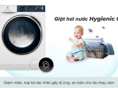Máy giặt Electrolux cửa trước này được trang bị công nghệ giặt hơi nước Hygienic Care giúp quần áo được giặt bằng hơi nước ở nhiệt độ cao, khả năng diệt khuẩn lên đến 99,9% góp phần đẩy lùi vi khuẩn và tác nhân gây dị ứng như mạt bụi, phấn hoa, lông mèo có trên quần áo.
