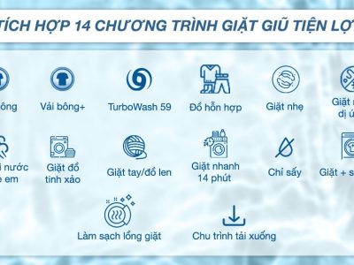 – Công nghệ giặt tiết kiệm TurboWash: hỗ trợ dòng xả nhanh và mạnh hơn, tăng tốc độ quay của lồng giặt để làm sạch nhanh hơn chất bẩn, bọt xà phòng, tiết kiệm thời gian giặt và nước tiêu thụ, đáp ứng nhu cầu giặt khối lượng lớn.