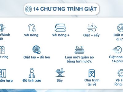 – Máy giặt được tích hợp 14 chương trình giặt tiện lợi, trong đó có các chương trình nổi bật như:
