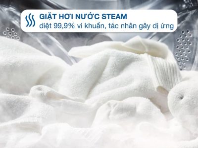– Công nghệ giặt hơi nước Steam: đánh bay 99,9% vi khuẩn, nấm mốc và tác nhân gây dị ứng, góp phần bảo vệ sức khỏe, làn da của cả gia đình, nhất là trẻ nhỏ.