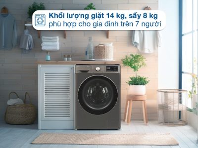 – Khối lượng giặt 14 kg đi kèm khối lượng sấy 8 kg, phù hợp với nhu cầu giặt cho gia đình trên 7 người hoặc ít thành viên hơn nhưng có nhu cầu giặt giũ cao.