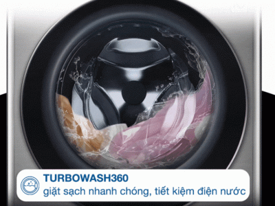 – Công nghệ TurboWash360: Dùng vòi phun 3D áp lực lớn giúp loại bỏ bụi bẩn nhanh hơn và giặt khối lượng quần áo lớn hơn. Nhờ đó có thể giặt và xả tối ưu, giúp tiết kiệm khoảng 1 giờ so với khi giặt thông thường và giảm hao phí điện năng lên đến hơn 15% và nước là hơn 40%.