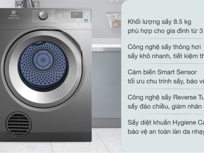 Máy sấy thông hơi Electrolux 9kg EDV904H3WC với các công nghệ tiên tiến, máy sấy không chỉ giúp quần áo khô nhanh mà còn giữ cho chúng mềm mại, bền đẹp lâu dài. Đây chắc chắn là giải pháp tối ưu giúp bạn tiết kiệm thời gian và công sức trong việc giặt giũ hàng ngày.
