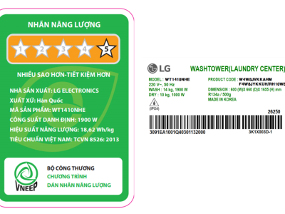 – Nhãn năng lượng: 5 sao. Hiệu suất sử dụng điện 18.62 Wh/kg.