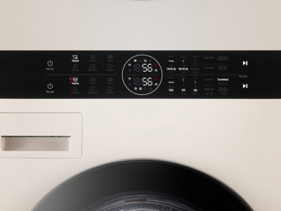 – Bảng điều khiển cảm ứng chỉ dẫn tiếng Việt kết hợp màn hình hiển thị sắc nét, thiết kế trực quan và nằm ngay ở vị trí trung tâm, bố trí cao hơn bảng điều khiển của 2 máy giặt và máy sấy đặt chồng lên nhau đến 85 mm. Nhờ đó người dùng dễ dàng tiếp cận và tùy chỉnh chương trình giặt, sấy linh hoạt.