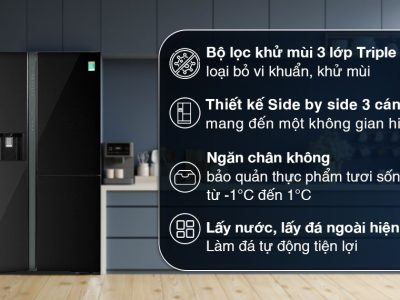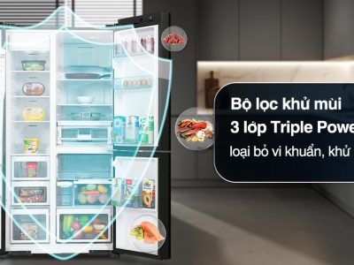 Bộ lọc khử mùi 3 lớp Triple Power: Diệt trừ đến tới 99% vi khuẩn, loại bỏ các chất gây mùi như mùi hành tỏi, cá sống,… đảm bảo không khí trong tủ thoáng sạch, thực phẩm không bị lẫn mùi.