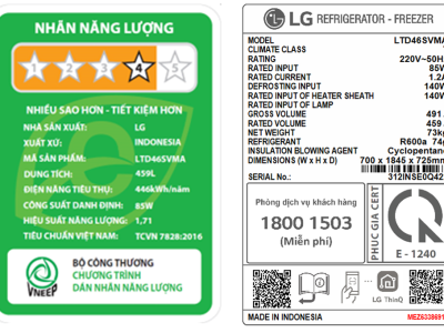 - Dung tích sử dụng 459 lít, phù hợp với gia đình 4 – 5 thành viên.