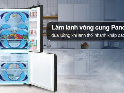 – Công nghệ làm lạnh vòng cung Panorama đưa luồng khí lạnh thổi nhanh, đồng đều khắp các ngóc ngách trong ngăn tủ, bảo quản thực phẩm tươi lâu hơn và trọn vị.
