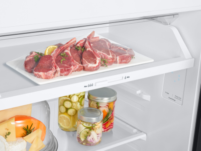 – Phía trên cùng của ngăn lạnh có ngăn đông mềm chuyên dụng, lưu trữ thực phẩm không cần rã đông và phía dưới cùng là ngăn rau củ có kích thước lớn, có thể lưu trữ được nhiều rau củ quả.